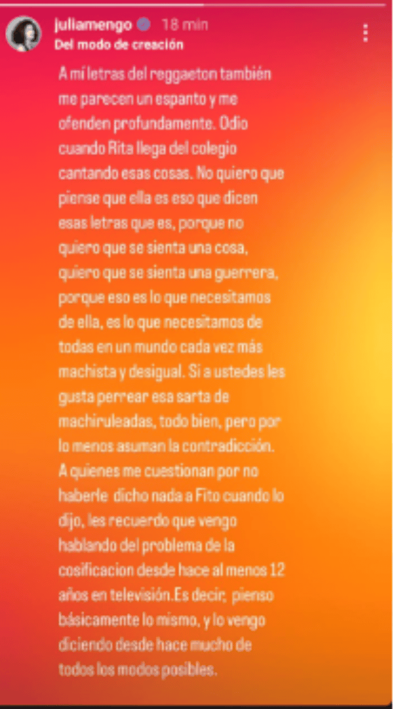 Julia Mengolini entrevistó a Fito Páez y en un momento de la conversación, la periodista le preguntó al músico sobre una frase que había dicho él en otra oportunidad y que hacía mención a las letras del reggaeton. El rosarino confirmó su pensamiento y fue crítico con las artistas de música urbana y el activismo feminista, encontrando allí una contradicción. En redes sociales, muchas personas cuestionaron que la abogada haya estado de acuerdo con lo que dijo el rosarino y este domingo escribió un mensaje en Instagram.