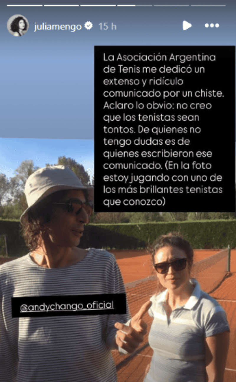 Más tarde, subió una foto de ella practicando el deporte y escribió que el comunidado de la AAT fue "extenso y ridículo". Y aclaró su pensamiento: "No creo que los tenistas sean tontos. De quienes no tengo dudas es de quienes escribieron ese comunicado". Y detalló que en la imagen que eligió está "jugando con unos de los mejores tenistas que conozco", y etiquetó a Andy Chango.