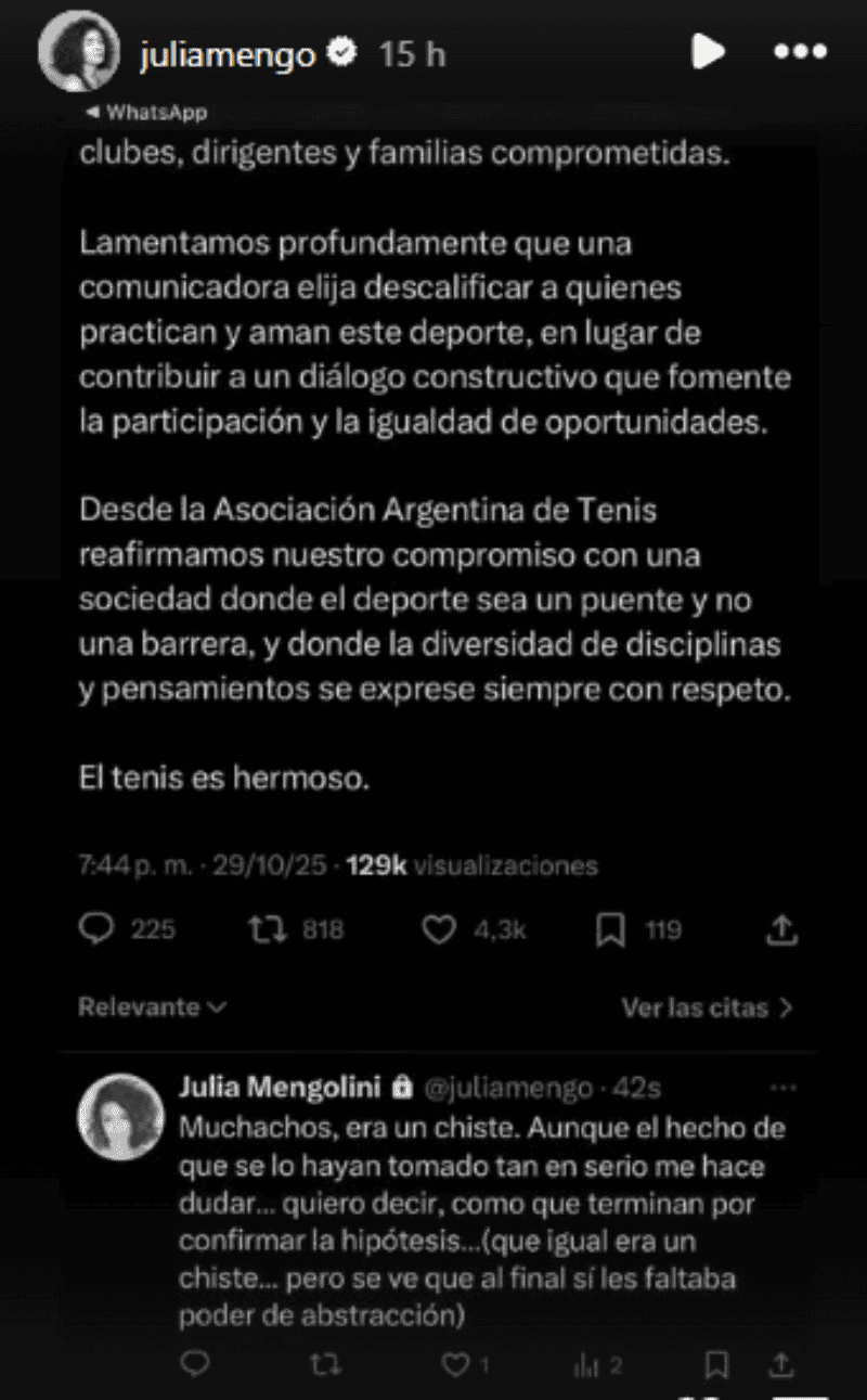 En su comunicado, la AAT “lamenta profundamente que una comunicadora elija descalificar a quienes practican y aman este deporte”. Además, la organización, presidida por el extenista Agustín Calleri, se lamentó por la descalificación realizada por la comunicadora, que, a su entender, no contribuyó “a un diálogo constructivo que fomente la participación y la igualdad de oportunidades”.