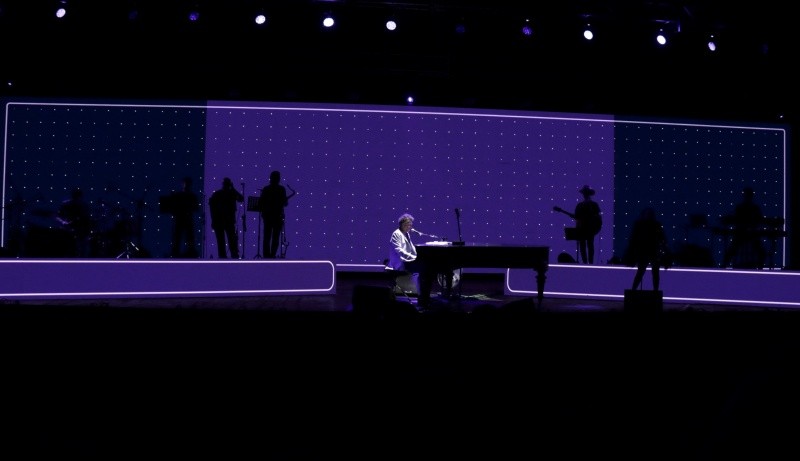 La pantalla de alta resolución que iba de un extremo a otro del escenario operó, salvo en algunos casos en los que las animaciones jugaron su parte en el guion del show (como en “Ciudad de pobres corazones”) por contraste: se tiño de rojo, azul, verde, celeste y sobre ese fondo se recortaban las figuras de los músicos (una suerte de guiño al afiche de Vértigo (1959) o al primer James Bond).