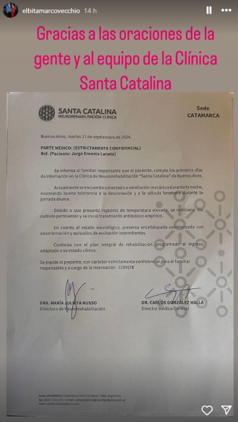 Marcovecchio compartió el documento en sus historias de Instagram, al tiempo que agradeció “a las oraciones de la gente y al equipo de la clínica Santa Catalina”.