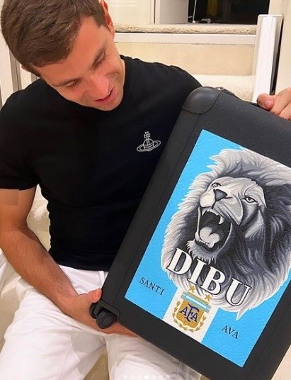En el programa mostraron la citada valija y en ella se pudo ver el dibujo de un león rugiente, el escudo de la Asociación del Fútbol Argentino y los nombres de los dos hijos de la pareja, Santi y Ava.