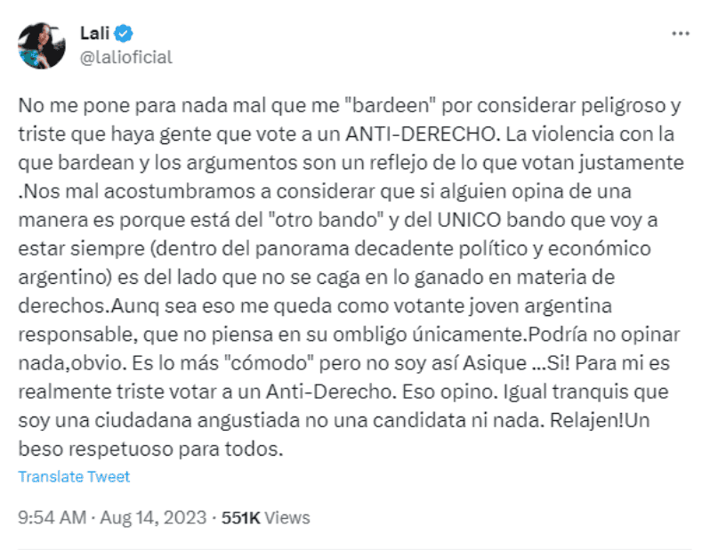 El primer mensaje que compartió la actriz fue un contundente “Que peligroso. Que miedo”. De inmediato las redes estallaron y Lali recibió ciento de mensajes y agresiones por su comentario en contra de Javier Milei.