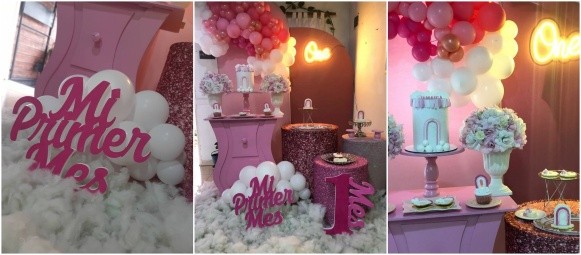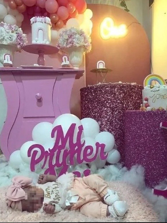 El miércoles la beba cumplió su primer mes de vida, y ambos decidieron celebrarlo a lo grande con una mesa dulce acorde para la ocasión: varias tortas, decoración en distintos tonos de rosa, carteles luminosos y varias exquisiteces dulces.