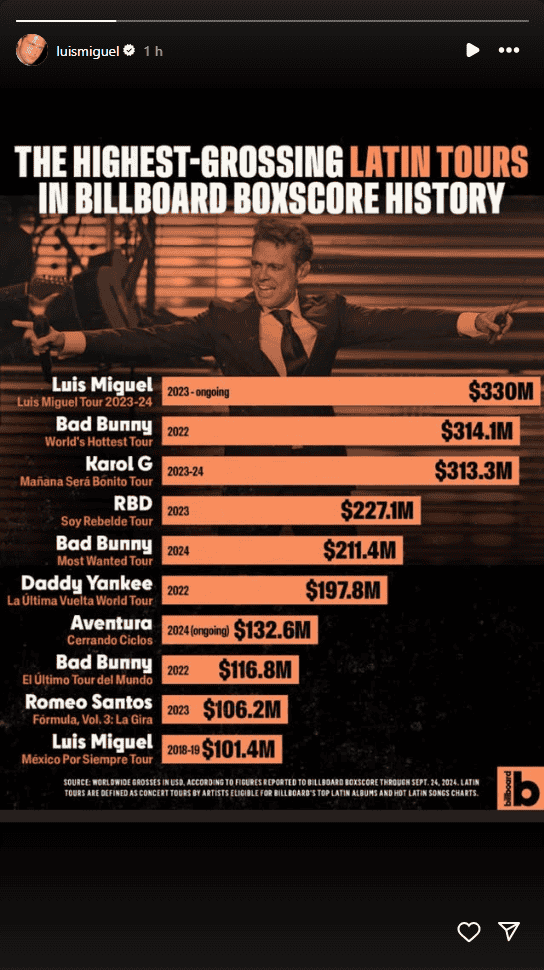 El “Luis Miguel Tour” que se llevó a cabo entre el 3 de agosto de 2023 y el 18 de diciembre de 2024 con producción de Fenix Entertainment, sigue consiguiendo nuevos récords. Según reveló el cantante en sus redes sociales, recaudó 330 millones de dólares, quedando en el primer puesto de “The Highest-Grossing Latin Tours In Billboard Boxscore History”.