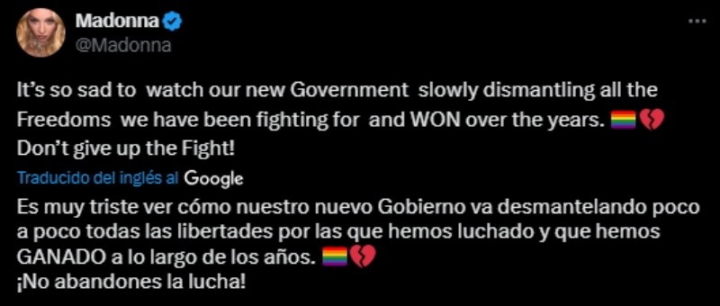 Y concluyó con un pedido: "¡No abandonen la lucha!". Al texto, la artista le sumó un emoji de la bandera del orgullo LGBTQ+ y un corazón roto.