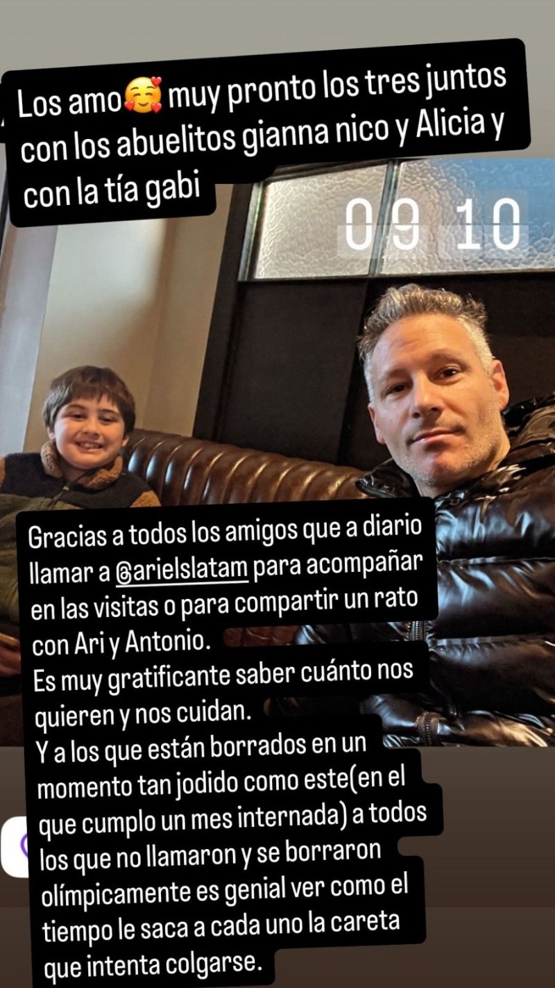 María Julia reposteó una foto de su hijo Antonio y Ariel Straccia que había publicado previamente su pareja con el texto: "Arrancando para el Alemán". Sin embargo, cambió el mensaje original y publicó una especie de descargo: "Gracias a todos los amigos que a diario llaman a @arielslatam para acompañar en las visitas o para compartir un rato con Ari y Antonio". Y sumó al respecto: "Es muy gratificante saber cuánto nos quieren y nos cuidan".