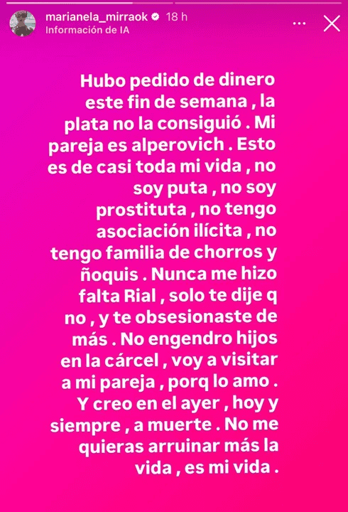 Lejos de salir a desmentir su romance con Alperovich, Marianela confirmó su vínculo con el exgobernador de Tucumán desde su cuenta de Instagram y aprovechó para cargar contra Rial. "Hubo pedido de dinero este fin de semana, la plata no la consiguió. Mi pareja es Alperovich. Esto es de casi toda mi vida, no soy puta, no soy prostituta, no tengo asociación ilícita, no tengo familia de chorros y ñoquis", posteó la ganadora de Gran Hermano de la edición de 2007.