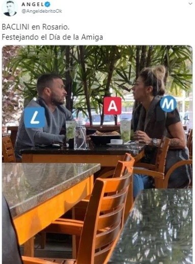 Martín Baclini se encuentra en Rosario y Ángel de Brito publicó una imagen en la que se ve al empresario tomando algo con una mujer en un bar local. "BACLINI en Rosario. Festejando el Día de la Amiga", escribió el conductor de Los Ángeles de la mañana y del Cantando 2020 para acompañar la foto.