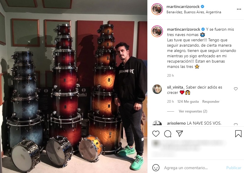 “Se fueron mis tres naves nomás, las tuve que vender. Tengo que seguir avanzando, de cierta manera me alegro, tienen que seguir sonando mientras yo sigo enfocado en mi recuperación. Están en buenas manos las tres”, posteó el baterista en sus redes, junto a una foto donde se lo ve de pie con las tres batas desarmadas.