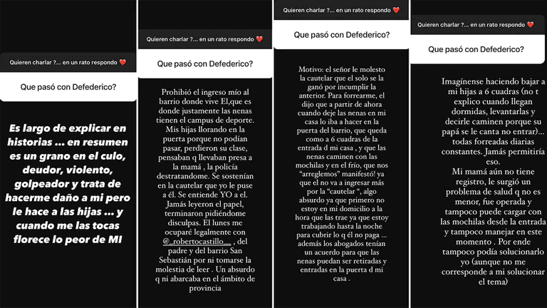 Primero, la panelista de Momento D (El Trece) reveló en su Instagram un episodio policial que vivió con su ex, cuando éste le prohibió el ingreso al barrio donde vive, que es donde las nenas tienen el campus de deporte.