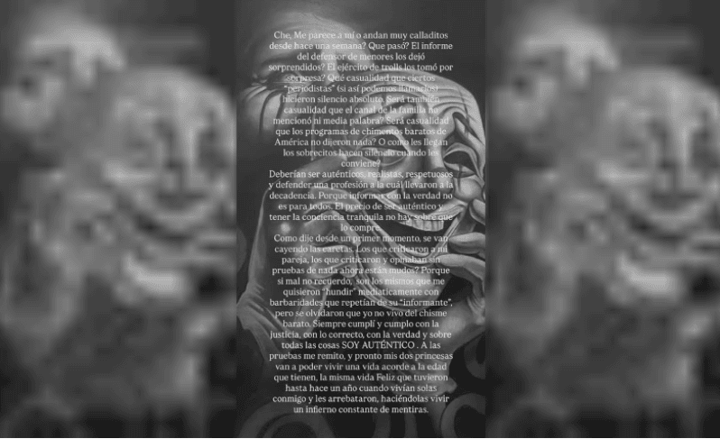 "Siempre cumplí y cumplo con la Justicia, con lo correcto, con la verdad y sobre todas las cosas soy auténtico. A las pruebas me remito y pronto mis dos princesas van a poder vivir una vida acorde a la edad que tienen, la misma vida feliz que tuvieron hasta hace un año cuando vivían solas conmigo y les arrebataron, haciéndolas vivir un infierno constante de mentiras", concluyó.