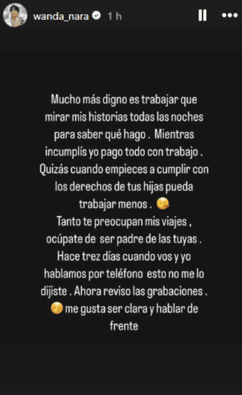 “Mucho más digno es trabajar que mirar mis historias todas las noches para saber qué hago”, señaló Nara en redes sociales y agregó: “Mientras incumplis yo pago todo con trabajo. Quizás cuando empieces a cumplir con los derechos de tus hijas pueda trabajar menos”.