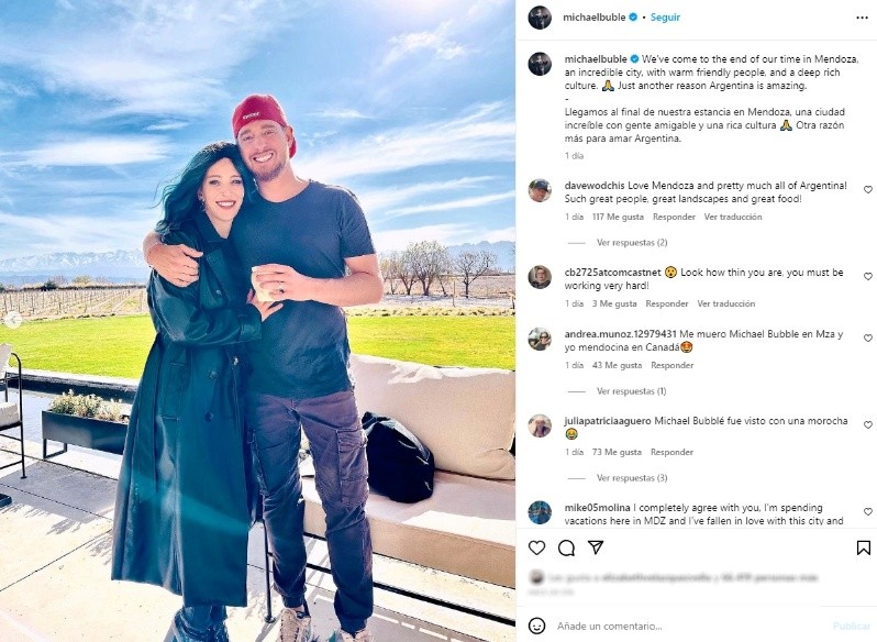 “Llegamos al final de nuestra estancia en Mendoza, una ciudad increíble con gente amigable y una rica cultura. Otra razón más para amar Argentina”, escribió Bublé junto a dos fotos.
