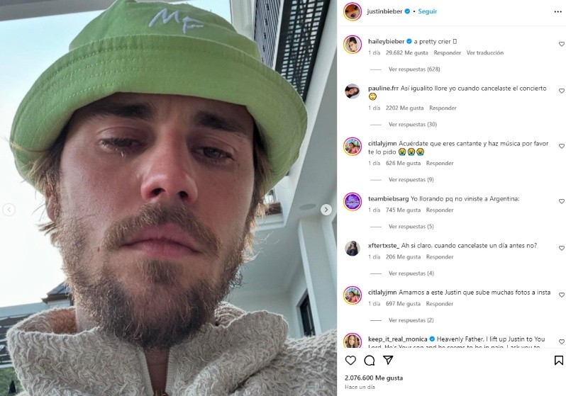 En la publicación se lee la frase “un bonito llorón” escrita por su esposa, Hailey Bieber. La pareja se mostró en público en el festival de música Coachella (Los Ángeles, EE.UU), donde el cantante volvió al escenario después de algún tiempo.