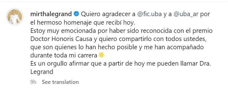 Muy contenta con el agasajo, Mirtha publicó en sus redes sociales: “Quiero agradecer a FIC.UBA y a @UBARectorado por el hermoso homenaje que recibí hoy”.