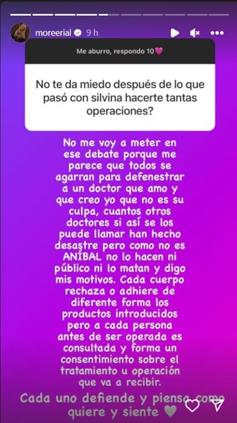 "Y digo mis motivos. Cada cuerpo adhiere o rechaza de diferente forma los residuos introducidos, pero cada persona antes de ser operada es consultada y forma un consentimiento sobre el tratamiento u operación que va a recibir", agregó Morena.
