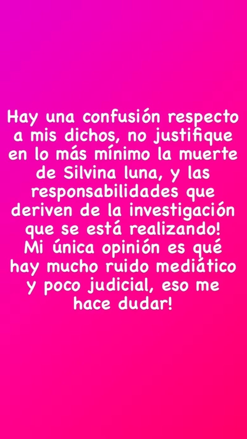 En ese sentido, explicó: "Hay una confusión respecto a mis dichos, no justifiqué en lo más mínimo la muerte de Silvina Luna ni las responsabilidades que deriven de la investigación que se está realizando. Mi única opinión es que hay mucho ruido mediático y poco judicial. Eso me hace dudar".