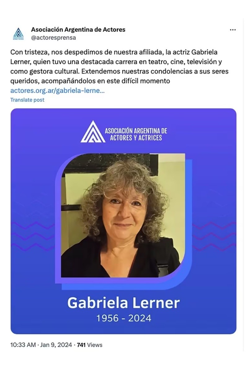“Con tristeza, nos despedimos de nuestra afiliada, la actriz Gabriela Lerner, quien tuvo una destacada carrera en teatro, cine, televisión y como gestora cultural. Extendemos nuestras condolencias a sus seres queridos, acompañándolos en este difícil momento”, escribió la Asociación Argentina de Actores y Actrices en su sitio oficial para informar la noticia de la muerte de la actriz.