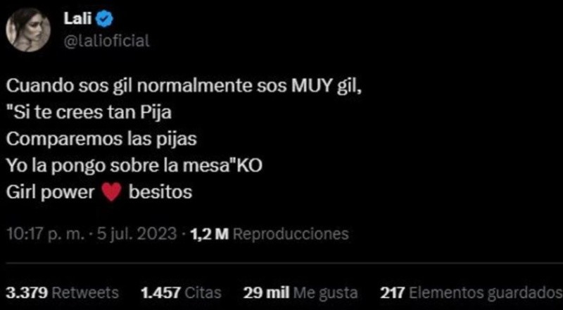 Un reciente tuit de Lali Espósito llamó la atención en redes sociales por la persona a la que estaría destinado. "Cuando sos gil, normalmente sos muy gil", escribió Lali sin mencionar a nadie. Sin embargo, el nombre de Martín Pérez Disalvo, conocido como Coscu en Twitch, circuló pegado al posteo.