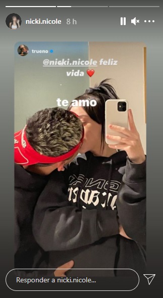 La publicación es una foto tomada frente al espejo que sacó Nicki en el momento en que ambos se besaban. A la captura, Trueno le sumó el emoji de un corazón y la frase “feliz vida”.