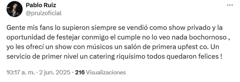"Mis fans lo supieron siempre, se vendió como show privado y la oportunidad de festejar conmigo el cumple, no lo veo nada bochornoso. Yo les ofrecí un show con músicos, un salón de primera Upfest co. Un servicio de primer nivel, un catering riquísimo, todos quedaron felices", explicó Pablito Ruiz en sus redes sociales.