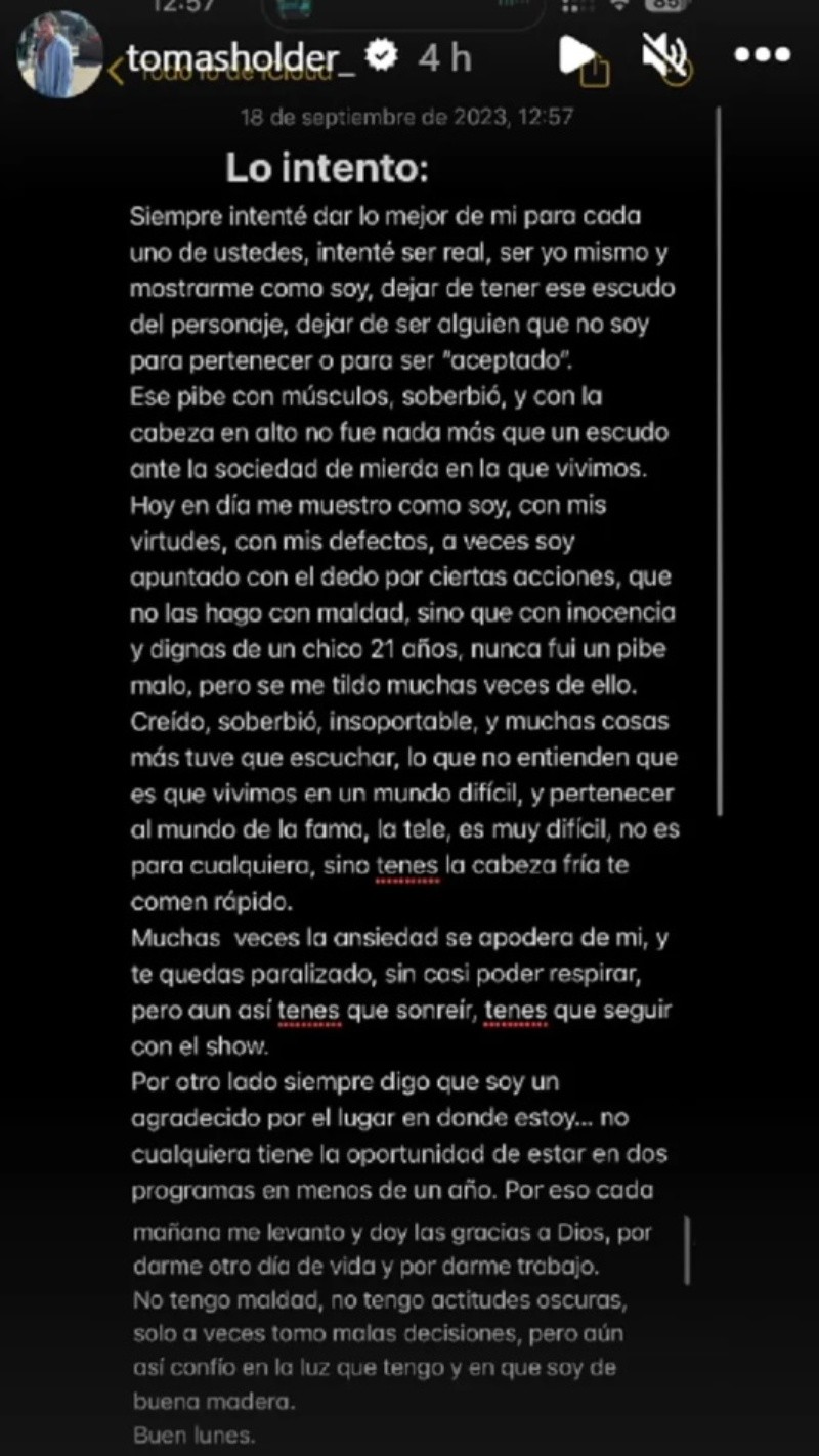 El influencer rosarino publicó en Instagram un extenso descargo. “Siempre intenté dar lo mejor de mí, para cada uno de ustedes, intenté ser real, ser yo mismo y mostrarme como soy, dejar de tener ese escudo del personaje, dejar de ser alguien que no soy para pertenecer o para ser aceptado", comienza el texto de Tomás Holder.
