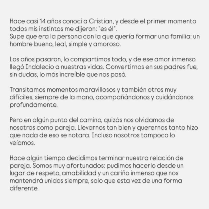Finalmente, explicó que la separación se concretó hace un tiempo y que ocurrió de manera madura y serena. “Hace un tiempo decidimos poner fin a nuestra relación de pareja. Somos muy afortunados de haberlo hecho desde el respeto, la amabilidad y un cariño inmenso que nos mantendrá unidos siempre, aunque ahora de otra forma”, concluyó.