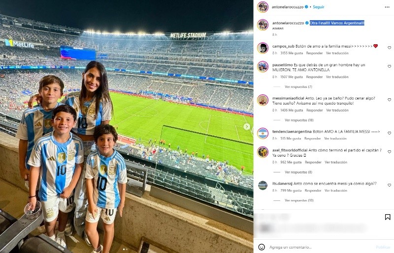 Tras la victoria de Argentina por 2-0 ante Canadá en la primera semifinal de la Copa América, Antonela Roccuzzo compartió una foto desde la cancha junto a sus hijos. La frase que acompaña en posteo en redes sociales lo dice todo: “Otra Final! Vamos Argentina!”.