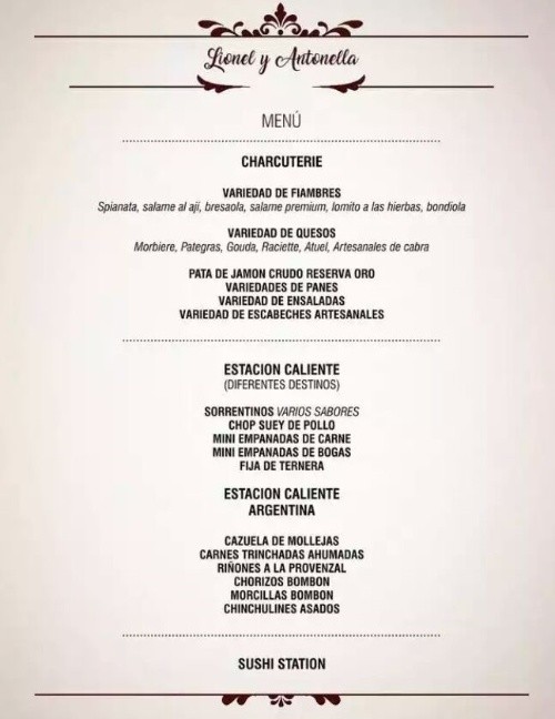 Cada vez falta menos para la que se encamina a ser la boda del año en Rosario. Y si bien los detalles del casamiento de Lionel Messi y Antonella Roccuzzo se guardan en secreto, se filtró cuál sería el menú elegido por la pareja para agasajar los invitados.