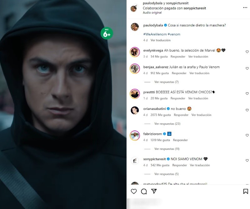 El futbolista argentino Paulo Dybala debutó como actor en un corto publicitario de la película Venom: The Last Dance y su esposa, Oriana Sabatini, no dejó pasar la chance para expresar qué le parecía la actuación. El delantero se sumó a la campaña promocional italiana de la cinta basada en el personaje de Marvel.