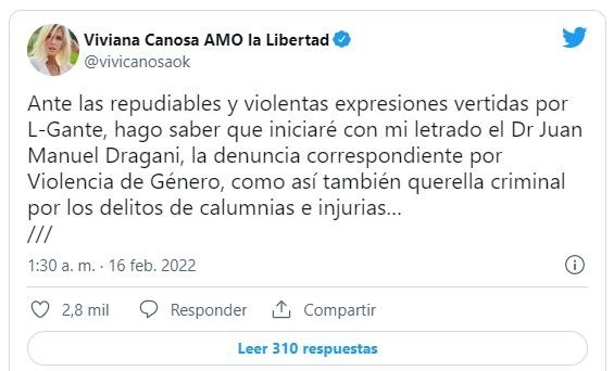 En segundo posteo, Canosa escribió: "Ante las repudiables y violentas expresiones vertidas por L-Gante, hago saber que iniciaré con mi letrado el Dr Juan Manuel Dragani, la denuncia correspondiente por Violencia de Género, como así también querella criminal por los delitos de calumnias e injurias…"