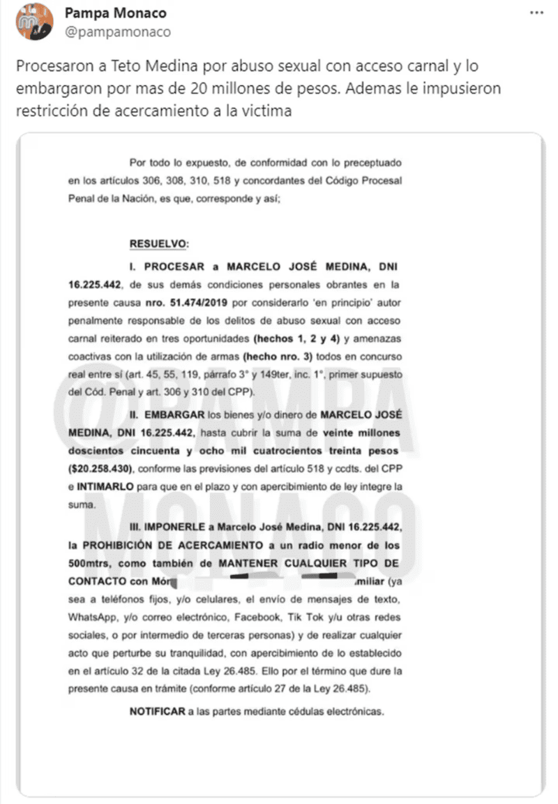 Marcelo "Teto" Medina fue procesado por delitos de "abuso sexual con acceso carnal reiterado en tres oportunidades" y "amenazas coactivas con la utilización de armas" a su ex pareja. En la resolución judicial se puede visualizar que, además, fue embargado por más de 20 millones de pesos y tiene una restricción de acercamiento a la víctima.