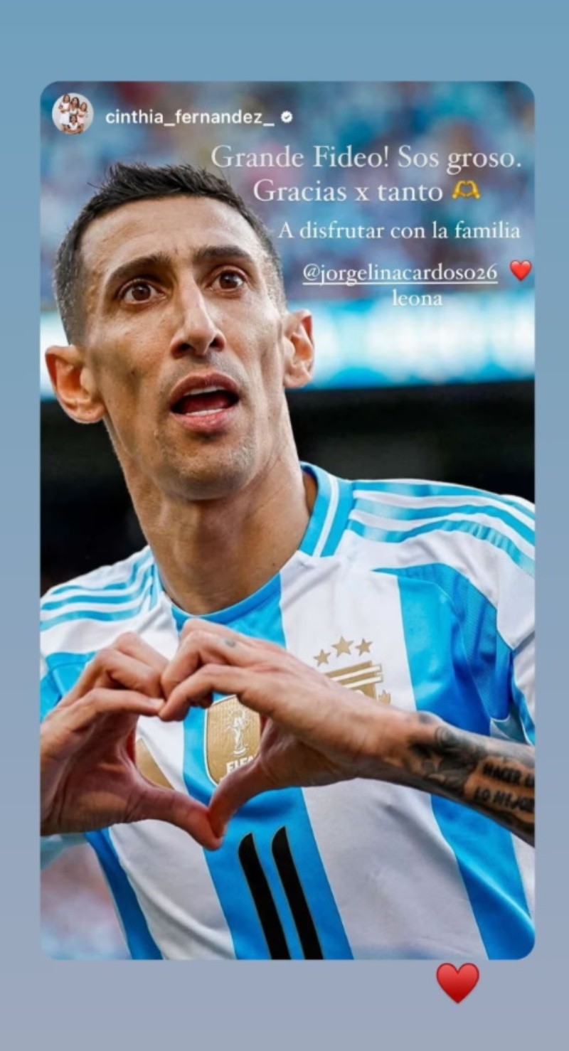 “¡Gracias Fideo! Sos groso. Gracias x tanto. A disfrutar con la familia”, escribió Cinthia una vez terminada la final de Copa América, en la que Argentina se impuso a Colombia por 1-0.