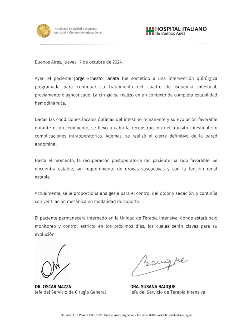A través del comunicado del hospital Italiano, los profesionales señalañaron: "La cirugía se realizó en un contexto de completa estabilidad hemodinámica. Dadas las condiciones óptimas del intestino remanente y su evolución favorable durante el procedimiento, se llevó a cabo la reconstrucción del tránsito intestinal, sin complicaciones intraoperatorias".