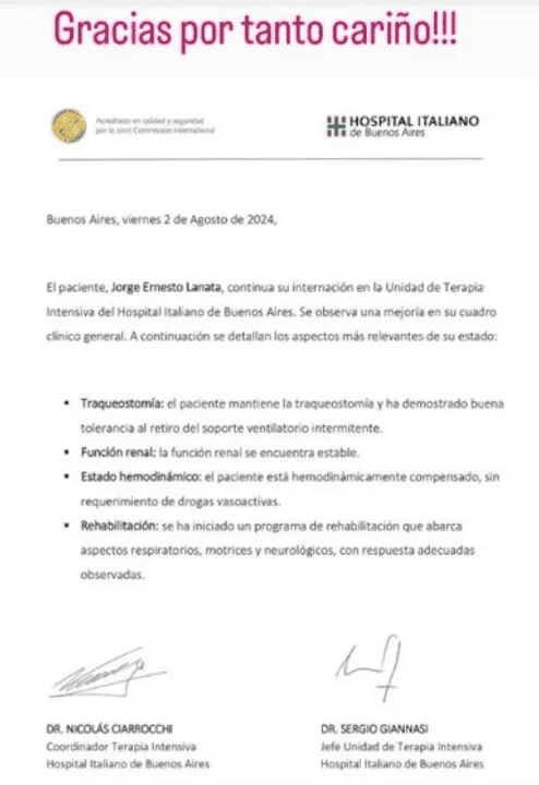 "El paciente Jorge Ernesto Lanata continúa su internación en la Unidad de Terapia Intensiva del Hospital Italiano de Buenos Aires. Se observa una mejoría en su cuadro clínico general", comienza el comunicado firmado por Nicolás Ciarrochi, Coordinador de Terapia Intensiva, y Sergio Giannasi, Jefe de la Unidad de Terapia Intensiva.