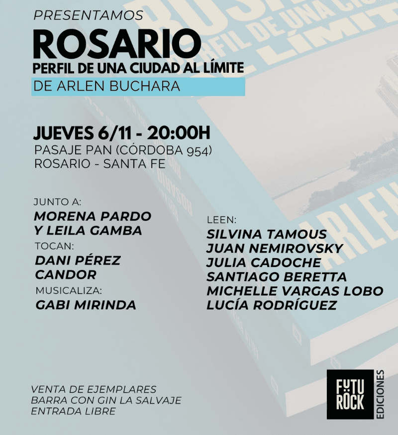 "Rosario, perfil de una ciudad al límite" se presenta este jueves a las 20 en el Pasaje Pam, Córdoba 954, con charla, lectura, música y tragos.