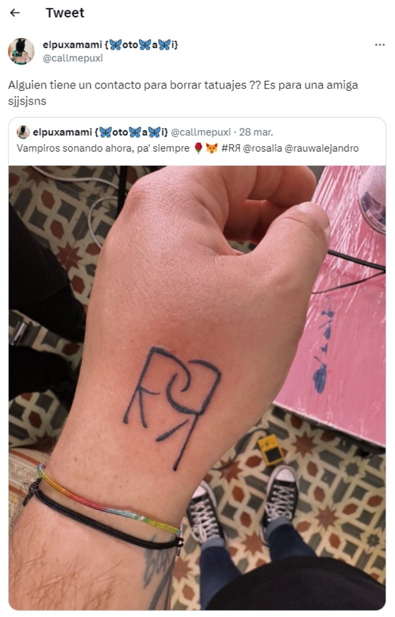 Luego de que se confirmara la separación de Rosalía y Rauw Alejandro, un usuario de redes sociales preguntó cómo borrar un tatuaje. El perfil de Twitter @callmepuxi compartió una foto con una réplica en una mano del logo del EP colaborativo que grabaron ambos artistas. Se trata de dos letras “R” unidas y de frente.