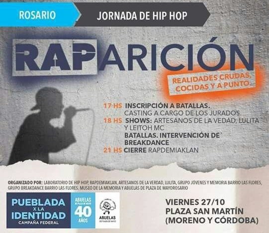 La actividad es organizada por el Museo de la Memoria junto a jóvenes del Laboratorio de Hip Hop, Rapdemia Klan, Lulita Tamagno, Grupo de Jóvenes y Memoria de Barrio Las Flores y Artesanos de la Verdad en el marco de la campaña Pueblada x la Identidad, impulsada por Abuelas de Plaza de Mayo Rosario con el objetivo de reforzar la búsqueda de los casi 400 nietos y nietas desaparecidos por el terrorismo de Estado que aún falta encontrar.