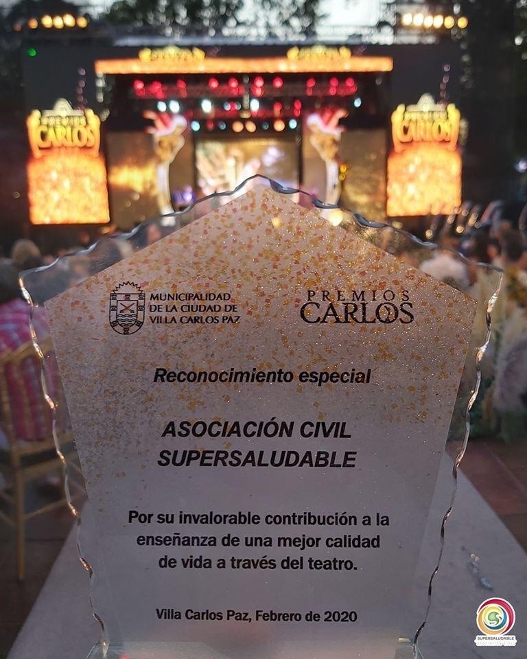 Esta semana la Asociación Civil rosarina Supersaludable recibió un reconocimiento especial en los Premios Carlos 2020 que se otorgaron en Carlos Paz, Córdoba, “por su invalorable contribución a la enseñanza de una mejor calidad de vida a través del teatro”. El licenciado en Nutrición Alberto Arribas, fundador y director de esta organización, expresó: “Esto es una emoción y un distinción al trabajo incansable de nuestra ONG pero también de un equipo que trabaja en tiempos difíciles para el sostenimiento y la continuidad de los proyectos”.