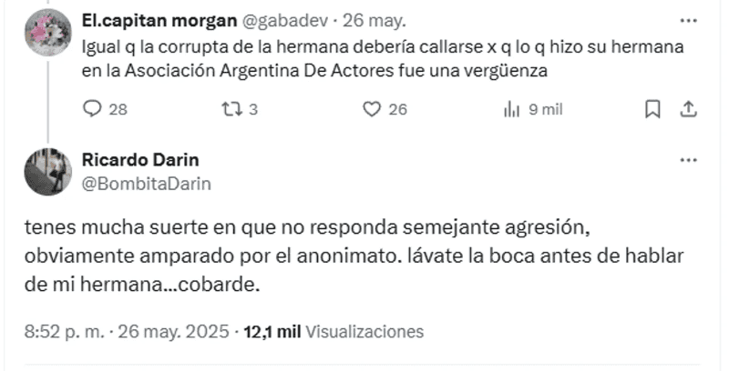 Lejos de quedarse callado, Darín respondió a ese tuit con dureza: "Tenés mucha suerte en que no responda semejante agresión, obviamente amparado por el anonimato. Lavate la boca antes de hablar de mi hermana, cobarde".