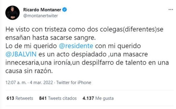 Montaner “He visto con tristeza como dos colegas (diferentes) se ensañan hasta sacarse sangre. Lo de mi querido Residente con mi querido J Balvin. Es un acto despiadado‚ una masacre innecesaria, una ironía, un despilfarro de talento en una causa sin razón”, escribió en su cuenta de Twitter.