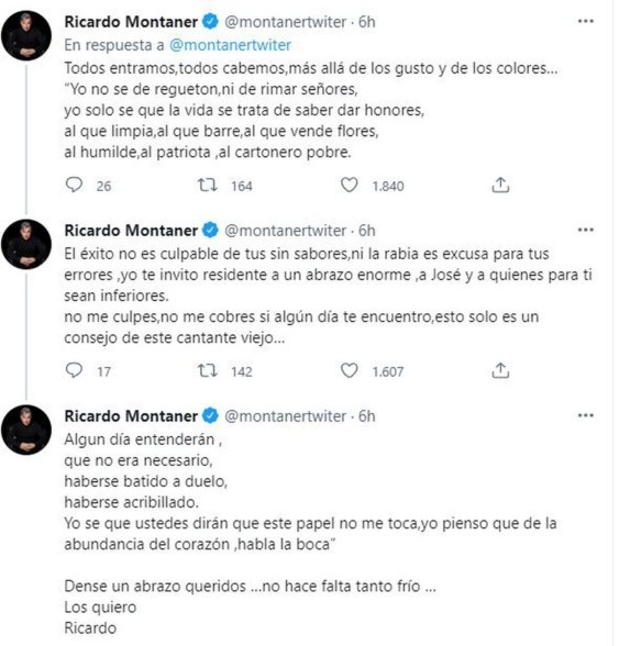 Por último, Montaner dejó un mensaje conciliador: “Algún día entenderán, que no era necesario, haberse batido a duelo, haberse acribillado. Yo se que ustedes dirán que este papel no me toca, yo pienso que de la abundancia del corazón, habla la boca. Dense un abrazo queridos …no hace falta tanto frío …Los quiero. Ricardo”.