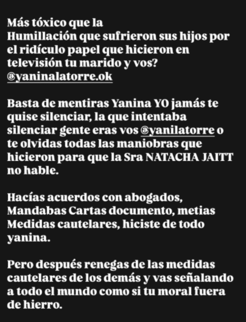 Además, la acusó de hipocresía respecto al uso de herramientas legales para silenciar a otros: “Basta de mentiras, Yanina. Yo jamás te quise silenciar. La que intentaba silenciar gente eras vos. ¿O te olvidás todas las maniobras que hicieron para que la Sra. Natacha Jaitt no hable?”, expresó.