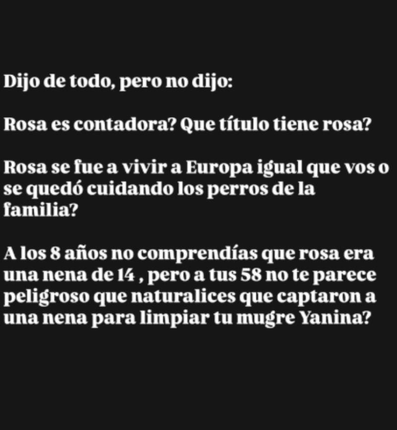 “A los 8 años no comprendías que Rosa era una nena de 14 años, pero a tus 58, ¿no te parece peligroso que naturalices que captaron a una nena para limpiar tu mugre, Yanina?”, preguntó. Y criticó duramente a la panelista y a su esposo, Diego Latorre, por las apariciones en los medios: “¿Más tóxico que la humillación que sufrieron sus hijos por el ridículo papel que hicieron en televisión tu marido y vos?”, disparó.