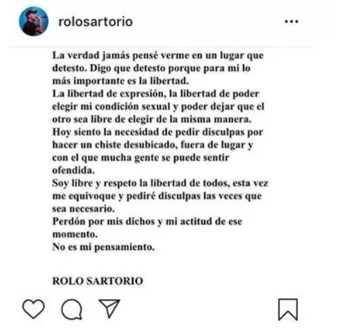 A través de un texto que publicó su cuenta de Instagram, Rolo Sartorio pidió disculpas por sus declaraciones durante el show que La Beriso ofreció el último fin de semana en la ciudad cordobesa de Embalse.