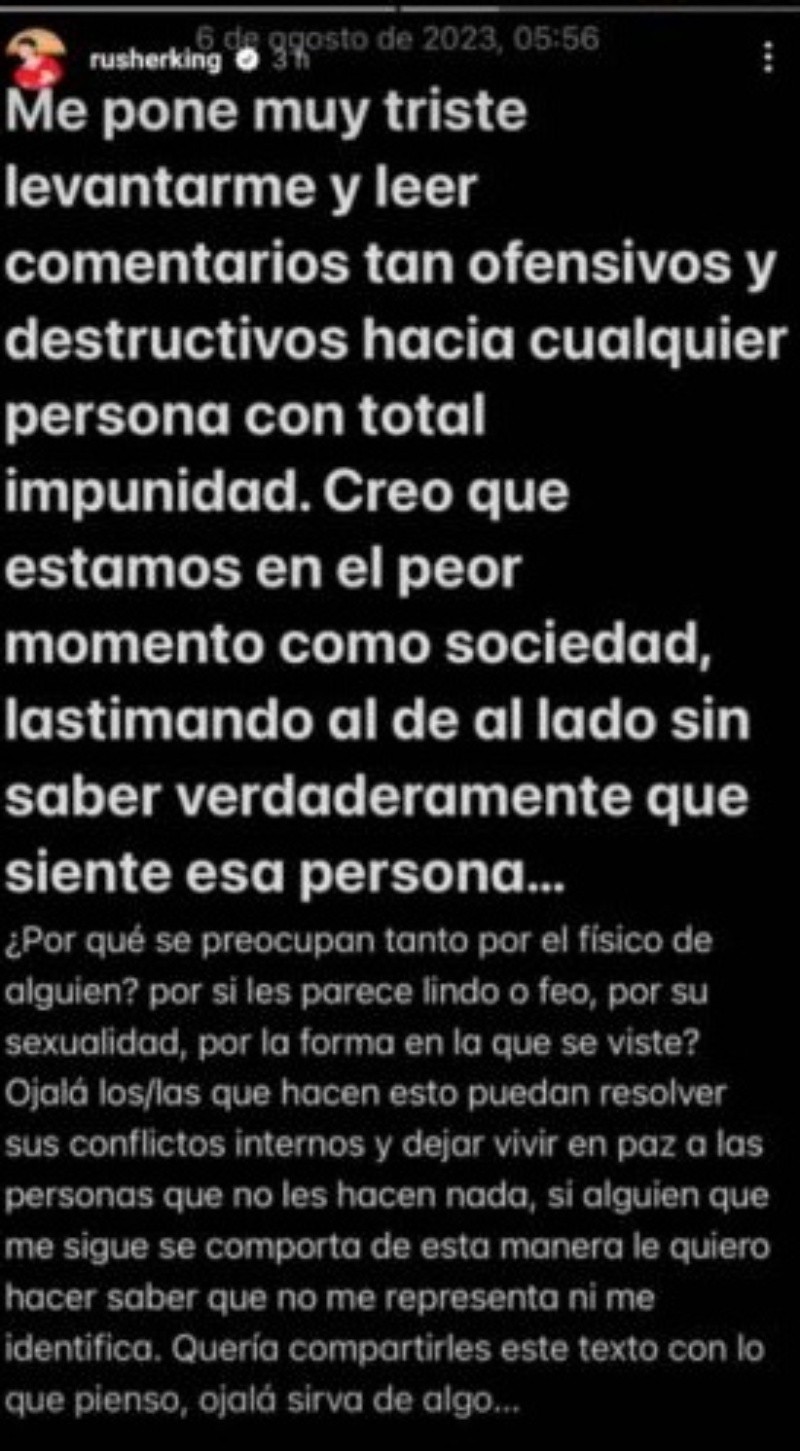"¿Por qué se preocupan tanto por el físico de alguien? ¿Por si les parece lindo o feo, por su sexualidad, por la forma en la que se viste? Ojalá los/las que hacen esto puedan resolver sus conflictos internos y dejar vivir en paz a las personas que no les hacen nada. Si alguien que me sigue se comporta de esa manera, le quiero hacer saber que no me representa ni me identifica. Quería compartirles este texto con lo que pienso, ojalá sirva de algo", cerró Rusherking.