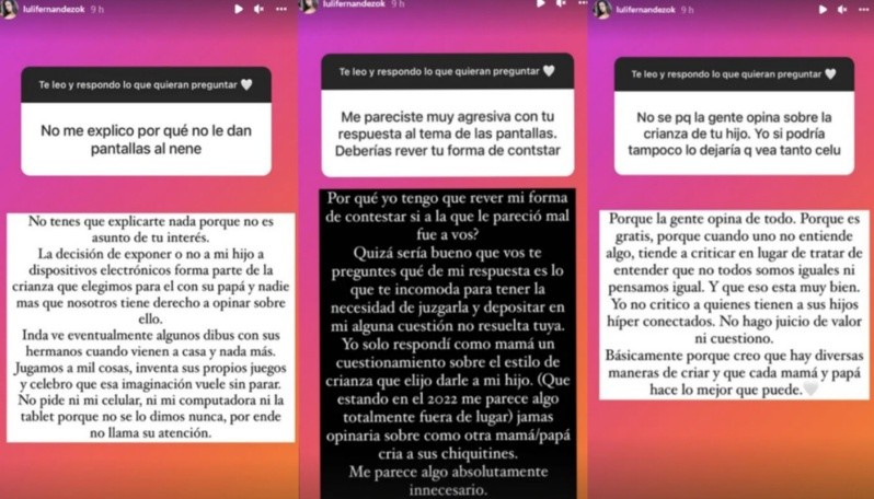 Y Luli respondió: "No es asunto de tu interés. La decisión de exponer o no a mi hijo a dispositivos electrónicos forma parte de la crianza que elegimos con su papá y nadie más que nosotros tiene derecho a opinar sobre eso”.