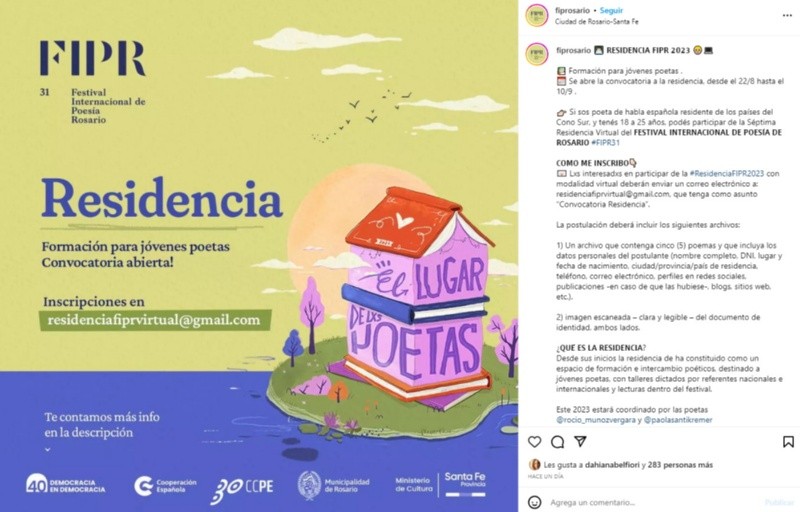 Quienes deseen participar deberán enviar, hasta el domingo 10 de septiembre, un correo electrónico a residenciafiprvirtual@gmail.com, que tenga como asunto “Convocatoria Residencia” con los materiales que se solicitan en las bases y condiciones que pueden consultarse en rosario.gob.ar. Para solicitar más información, las personas interesadas pueden comunicarse al mismo correo de la inscripción.