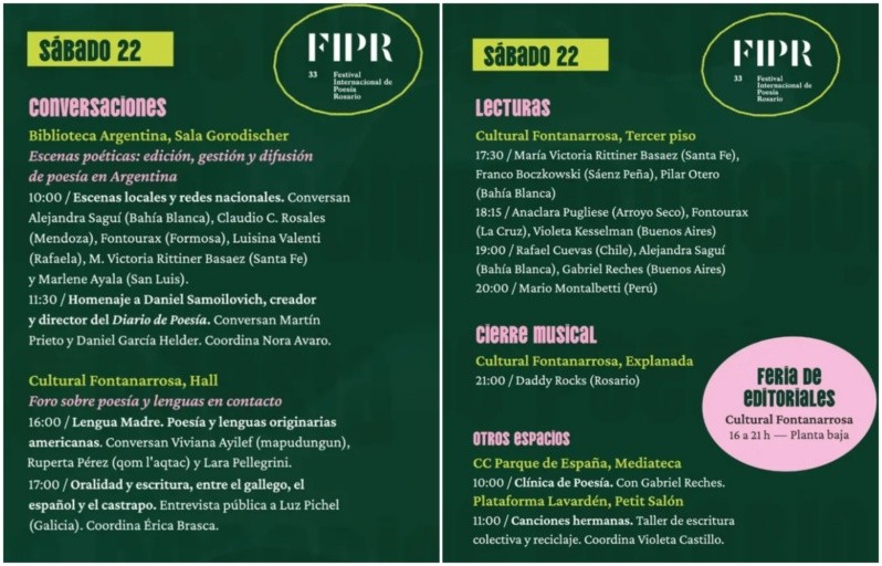 Desde este jueves hasta el sábado 22 de noviembre, se llevará a cabo el 33° Festival Internacional de Poesía de Rosario (FIPR), organizado por el Ministerio de Cultura del Gobierno de la provincia de Santa Fe, la Secretaría de Cultura y Educación de la Municipalidad de Rosario y el Centro Cultural Parque de España.